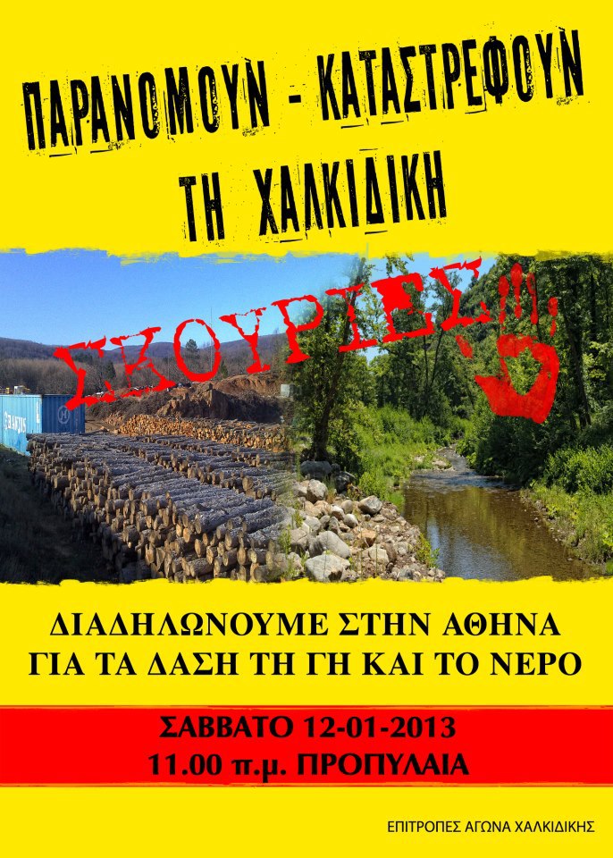 Διαδήλωση στην Αθήνα διοργανώνουν οι επιτροπές αγώνα της Χαλκιδικής ενάντια στην καταστροφή της Γης και του Νερού από τα μεταλλεία χρυσού, το Σάββατο, 12 Γενάρη 2013, στις 11 π.μ., στα Προπύλαια.